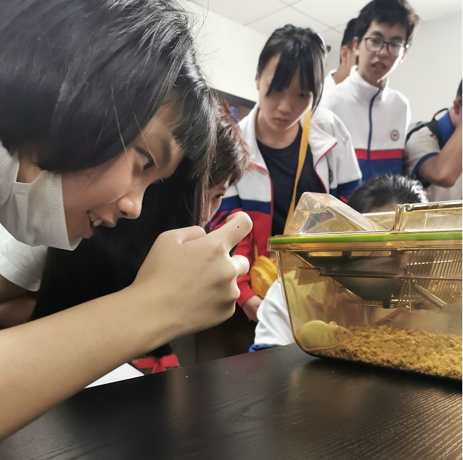 助理教授吴剑锋为大家带来了一场精彩的科普讲座,吴老师从小鼠的基本知识开始,介绍了常见小鼠品系、免疫缺陷小鼠在肿瘤生物学的作用、基因工程小鼠应用,之后为加深大家的印象,吴剑锋老师和动物中心吴素琴老师准备了不同品系的小鼠,供来访家长同学观察。