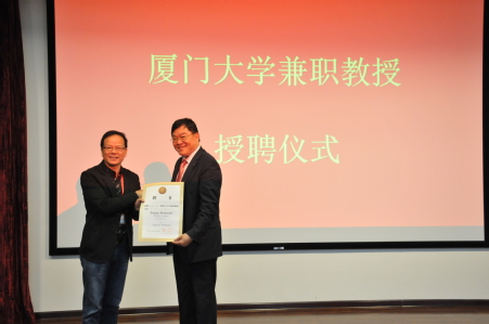 在演讲正式开始前,首先进行的是授聘仪式。生命科学学院原院长林圣彩教授为裴元虎博士颁发了兼职教授聘书。林圣彩教授称赞道,裴元虎博士是一位内心怀有精神支撑,淡定、有修养的企业家,是我室同学学习的榜样。