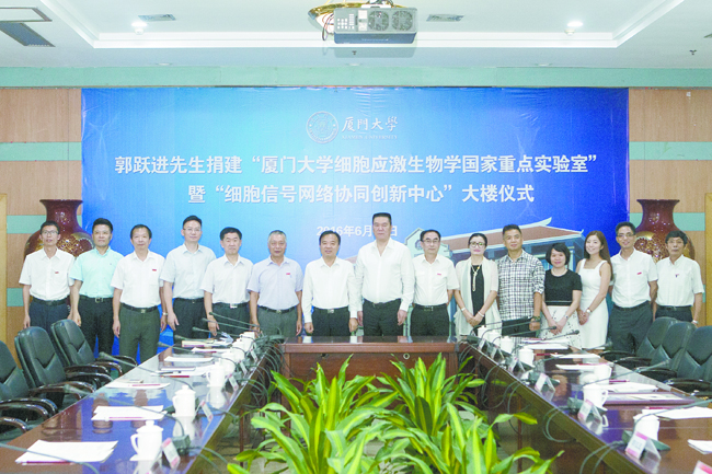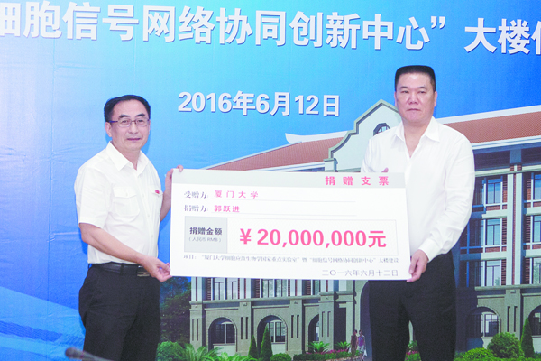 近日,厦门豪客来投资控股有限公司董事长郭跃进先生以个人名义捐资人民币2000万元,用于建设“厦门大学细胞应激生物学国家重点实验室”暨“细胞信号网络协同创新中心”大楼。6月12日上午,捐赠仪式在颂恩楼举行。校党委书记张彦与郭跃进致辞。