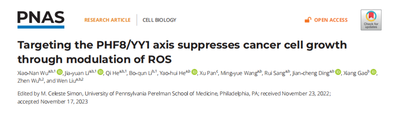 2024年1月3日,刘文教授研究团队与吴振教授研究团队于PNAS在线发表题为“Targeting the PHF8/YY1 Axis Suppresses Cancer Cell Growth Through Modulation of ROS”的研究成果。该研究阐述了PHF8作为转录共抑制因子,通过直接去甲基化非组蛋白底物YY1抑制大量 ETC 基因,从而驱动 ROS 产生和癌细胞生长。基于该分子机制,研究团队进一步筛选获得特异性靶向PHF8酶活性的小分子抑制剂iPHF8。iPHF8能显著地抑制包括结直肠癌和肺癌在内的肿瘤生长。该研究为以PHF8为靶点的抗肿瘤药物开发提供了新思路,为治疗结肠癌、肺癌等癌症提供了一种有前景的策略。这是继刘文教授团队在发现PHF8去甲基化组蛋白H4K20me1激活细胞周期相关基因促进细胞周期进程之后(Nature,2010),在去甲基化酶PHF8的底物鉴定及促癌机制研究的又一个重要的发现。