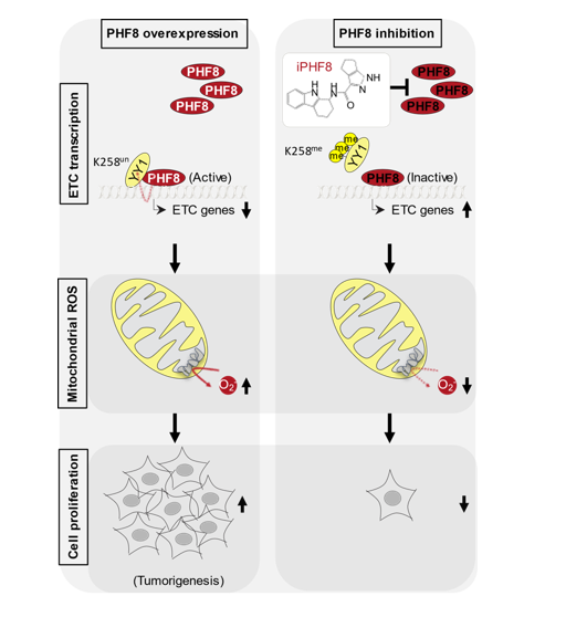 模式图:PHF8介导的YY1 K258去甲基化在ETC基因转录调控、mROS产生和肿瘤细胞生长中的作用机制和靶向干预研究