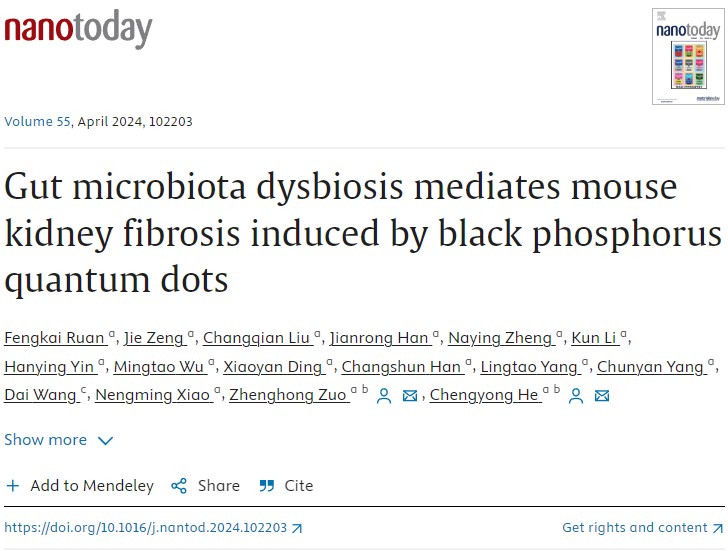 近日,工程技术-材料科学领域国际重要期刊《Nano Today》发表了厦门大学何承勇、左正宏团队题为“Gut microbiota dysbiosis mediates mouse kidney fibrosis induced by black phosphorus quantum dots”的研究论文,该研究报告了肠道菌群在BPQDs纳米材料暴露诱导的肾脏损伤中的作用,对于评估纳米材料的安全性具有重要意义。