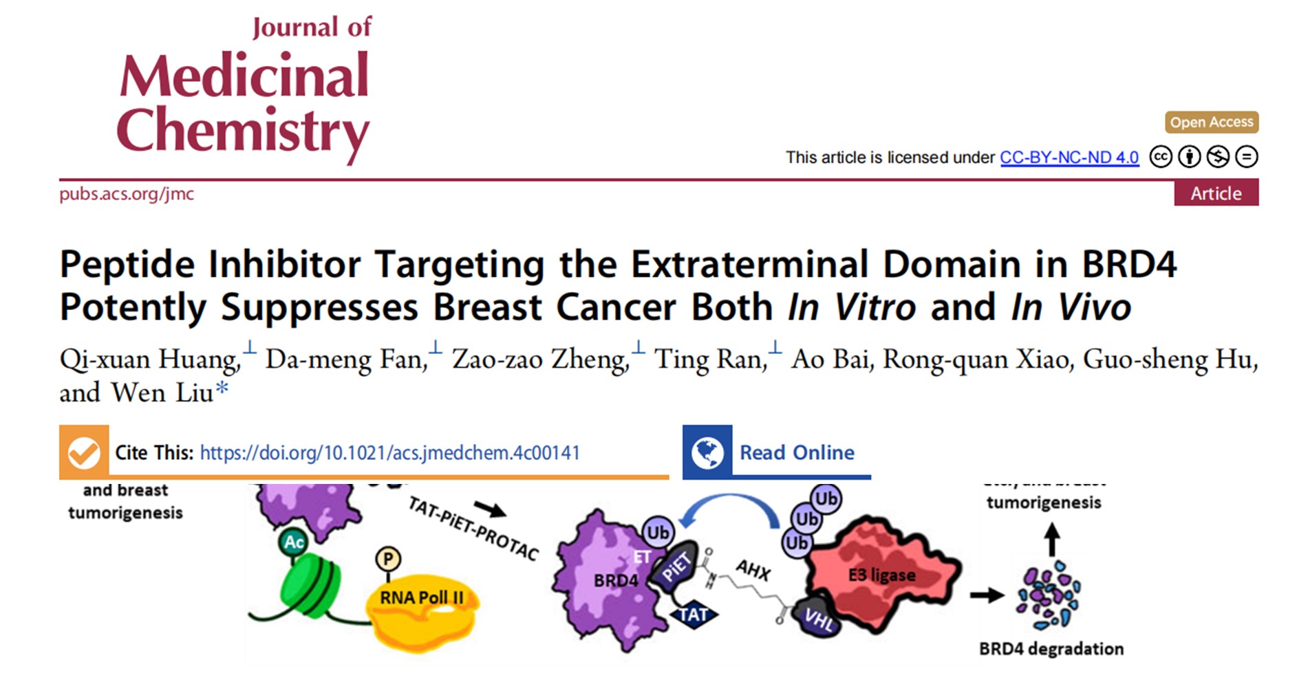 刘文教授团队前期研究发现了增强子结合的BRD4通过其ET结构域招募去甲基化酶JMJD6远程调控P-TEFb蛋白复合体的活性,从而调控邻近基因转录延伸的转录调控新模式(Cell. 2013 Dec 19;155(7):1581-95)。最近,团队发现BRD4和JMJD6是调控ERα介导的基因转录、癌细胞生长和肿瘤形成的重要蛋白因子,在ERα阳性乳腺癌的发生发展中发挥至关重要作用(Mol Cell. 2018 Apr 19;70(2):340-357.e8; Nucleic Acids Res. 2022 Oct 14;50(18):10230-10248.)。国内外同行研究也表明BRD4和JMJD6参与多种癌症的发生发展,是极具潜力的药物靶点。BRD4和JMJD6调控基因转录和参与癌症发生发展的功能既依赖于JMJD6酶活性,又依赖于两者的相互作用。基于此,团队多角度进行了相关干预手段的研究:首先是针对JMJD6的酶活性中心成药性口袋进行了大规模的活性小分子筛选,获得了多个和JMJD6结合力强、酶活性抑制率高、特异性好和癌细胞生长抑制率高的活性小分子(ACS Med. Chem. Lett. 2019 Nov 19, 10, 1609−1613; ZL201711476073.8; ZL202010973010.9)。其中名为iJMJD6的小分子在小鼠肿瘤模型中(包括雌激素受体阳性乳腺癌、三阴性乳腺癌、肝癌和结直肠癌在内的多种癌细胞来源移植瘤和PDX模型)对肿瘤生长和转移具有非常显著的抑制效果。在雌激素受体阳性乳腺癌中能有效克服内分泌药物(他莫昔芬和氟维司群)引起的耐药。药代动力学研究表明iJMJD6具有很好的成药性(PNAS. 2022 Aug 23;119 (34))。其次,研究团队针对BRD4和JMJD6蛋白相互作用展开了短肽抑制剂的筛选。团队首先通过对接分析和筛选确定了JMJD6中与ET具有最高亲和力的短肽序列,并且这一序列在体外能有效破坏BRD4与JMJD6之间的相互作用。该短肽被命名为PiET。TAT穿膜序列修饰的PiET,即TAT-PiET,在细胞中有效地阻断了BRD4与JMJD6的相互作用。进一步通过蛋白水解靶向嵌合体(PROTAC)技术修饰的TAT-PiET,即TAT-PiET-PROTAC,以ET依赖的方式降解BRD4蛋白,表明PiET特异性地靶向BRD4的ET结构域。TAT-PiET和TAT-PiET-PROTAC有效抑制了BRD4/JMJD6介导靶基因的转录激活,其中包括MYC和CCND1;有效抑制了乳腺癌细胞的生长、克隆形成、迁移和侵袭;有效抑制了小鼠移植瘤模型中的乳腺肿瘤的生长。基于之前的分子机制研究,团队进一步展示了TAT-PiET/TAT-PiET-PROTAC与JQ1、iJMJD6或ICI的联合治疗对乳腺肿瘤生长的抑制具有协同效应,并具有良好的安全性。此外,TAT-PiET/TAT-PiET-PROTAC能使他莫昔芬耐药的ERα阳性乳腺癌细胞对他莫昔芬重新敏感化。