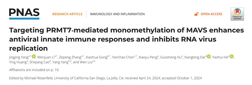 2024年11月15日,厦门大学药学院刘文教授团队在PNAS杂志在线发表了题为“Targeting PRMT7-mediated mono-methylation of MAVS enhances antiviral innate immune responses and inhibits RNA virus replication”的研究论文。该研究详细阐述了精氨酸甲基转移酶PRMT7通过靶向线粒体抗病毒信号蛋白MAVS抑制RLR信号通路介导的I型干扰素通路的功能和分子机制。