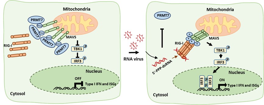 这一研究结果揭示了PRMT7介导的精氨酸单甲基化修饰在调节MAVS介导的抗病毒免疫反应中发挥着关键作用,进一步深化了对抗病毒免疫调控机制的认识。同时,靶向精氨酸甲基化修饰有望为治疗RNA病毒感染提供一种有效的治疗途径。