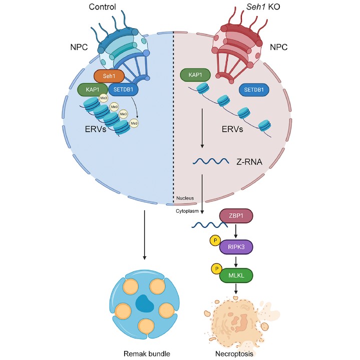 该团队于2019年发表在Neuron杂志上的工作证明了作为核孔复合体组分的核孔蛋白参与中枢神经系统的髓鞘形成4。基于此,他们对核孔蛋白在外周神经系统中扮演何种角色展开一系列研究。首先发现随着小鼠年龄的增长,许多核孔蛋白的表达量显著减少。考虑到施旺细胞在外周神经和髓鞘生成中的作用,研究人员进一步构建了核孔蛋白Seh1施旺细胞谱系特异性敲除的小鼠,发现该基因缺失并未引起髓鞘生成的明显异常,但会造成小鼠坐骨神经中非髓鞘化施旺细胞的逐渐减少,并伴随小直径神经纤维的变性以及感觉系统功能障碍。进一步的研究发现Seh1基因缺失的坐骨神经中有坏死的发生和免疫反应的激活。机制研究发现,Seh1通过介导组蛋白甲基转移酶SETDB1和其支架蛋白KAP1之间的相互作用来实现对染色质的甲基化抑制,以维持基因组的稳定性。Seh1缺失后,SETDB1-KAP1相互作用的破坏使内源性逆转录病毒(Endogenous retroviruses,ERVs)失去抑制,从而触发非髓鞘化施旺细胞中非经典通路的程序性坏死。此外,该研究发现使用抑制ERVs产生的药物TDF(tenofovir disoproxil fumarate)处理Seh1基因敲除小鼠,能够在一定程度上缓解其神经异常,为以抑制内源性逆转录病毒的产生治疗外周神经病变提供了新思路。
