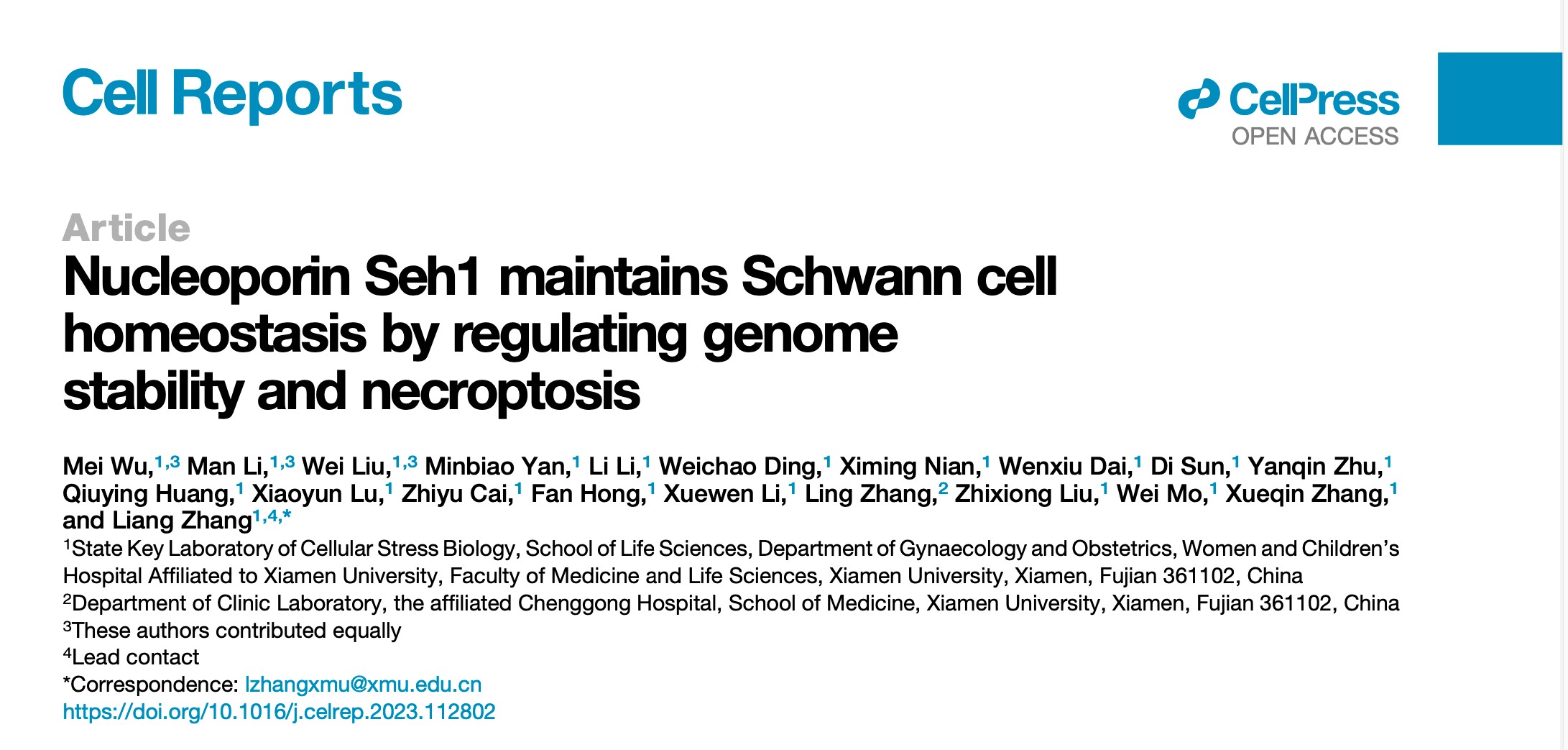 2023年7月14日,细胞应激生物学国家重点实验室、厦门大学生命科学学院、厦门大学附属妇女儿童医院的张亮教授课题组在Cell Reports上发表了题为Nucleoporin Seh1 maintains Schwann cell homeostasis by regulating genome stability and necroptosis的论文,揭示核孔蛋白Seh1在施旺细胞基因组完整性维持和外周神经系统中的功能和作用机制。