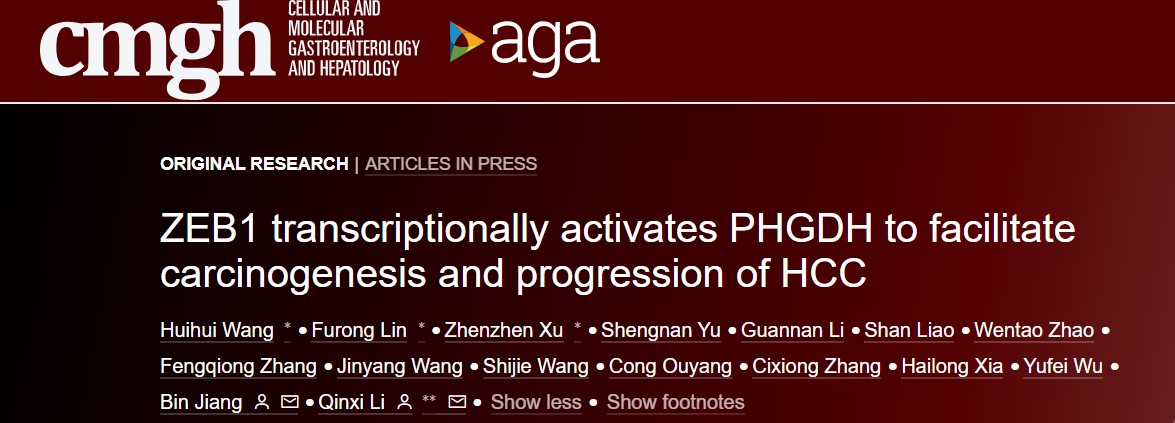 近日,该研究成果以题为“ZEB1 transcriptionally activates PHGDH to facilitate carcinogenesis and progression of HCC”的研究论文在线发表在Cellular and Molecular Gastroenterology and Hepatology期刊上。