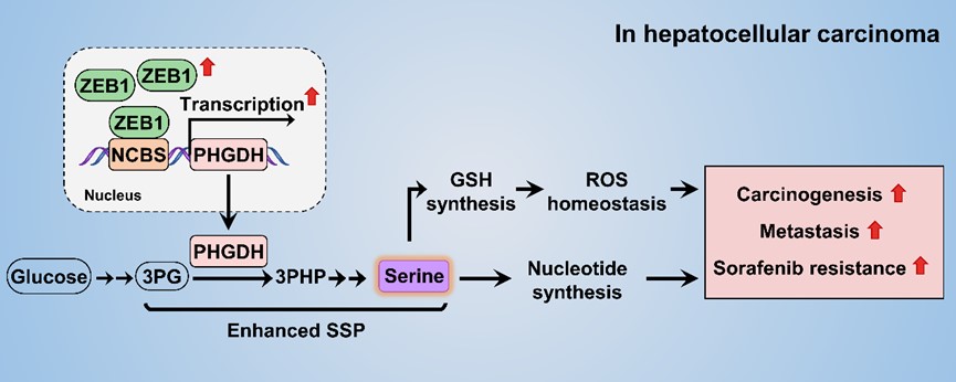 锌指E盒结合同源蛋白1 (zinc finger E-box-binding homeobox protein 1, ZEB1)是一个能促进上皮-间质转化 (epithelial-mesenchymal transition, EMT)的转录因子,在肝细胞癌(hepatocellular carcinoma,HCC)中表达升高。但ZEB1是否通过调控丝氨酸合成代谢通路促进HCC发生尚不清楚。我院李勤喜教授团队发现ZEB1通过转录激活丝氨酸合成的关键酶磷酸甘油酸脱氢酶(Phosphoglycerate dehydrogenase,PHGDH)增强丝氨酸从头合成通路(de novo serine synthesis pathway,SSP)的流量,从而促进肝细胞癌的发生和转移。有趣的是,ZEB1通过结合PHGDH启动子区域的非经典结合位点 (Non-classic binding site, NCBS)激活其转录。该研究不仅加深了人们对ZEB1作为转录因子通过重编程代谢途径促进肝癌发生发展的认识,还为肝细胞癌的临床治疗提供了新的思路。