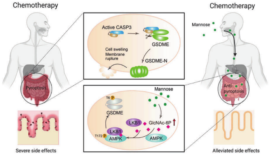 甘露糖(Mannose)是葡萄糖的类似物。一旦进入细胞,甘露糖能够通过己糖胺生物合成途径(HBP)提高代谢物GlcNAc-6P含量,促进GlcNAc-6P结合到AMPK,进而有利于LKB1的结合以激活 AMPK。活化的AMPK随后在Thr6位点磷酸化GSDME,导致caspase-3不能结合并剪切GSDME,从而抑制细胞焦亡。课题组进一步在类器官和各种小鼠模型中证实了甘露糖能够抑制GSDME介导的肠道或肾脏发生细胞焦亡,由此减轻一线化疗药顺铂或奥沙利铂引起的肠道或肾脏毒副作用;而在表达GSDME (T6A)突变体小鼠中,甘露糖则没有效果;但是甘露糖不会影响化疗药物对肿瘤的治疗效果。重要的是,在临床接受XELOX化疗方案的肿瘤患者出现腹泻以及粪便白细胞数显著增多等化疗副作用,而在补充甘露糖后,化疗副作用的表现则显著减轻。综上,该研究不仅揭示了甘露糖激活AMPK依赖于HBP中代谢物GlcNAc-6P的提高,AMPK激活可以磷酸化GSDME Thr6,导致caspase-3不能结合并剪切GSDME蛋白,引起焦亡抑制的新机制;而且在小鼠模型和临床患者中进一步证实了甘露糖可以减轻化疗药物引起的毒副作用,为临床减轻化疗副作用提供了新思路和新策略,具有很好的应用前景。
