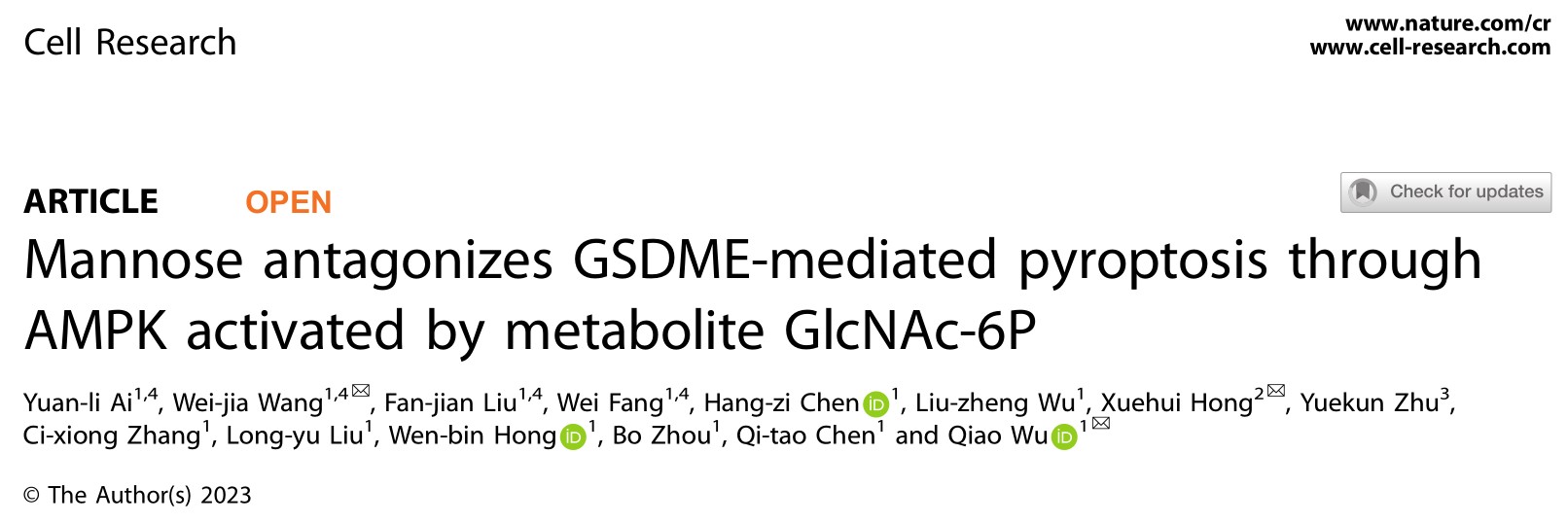2023年7月17日,Cell Research在线发表了吴乔教授团队的最新研究成果:Mannose antagonizes GSDME-mediated pyroptosis through AMPK activated by metabolite GlcNAc-6P。该研究发现,临床药物甘露糖激活的AMPK可以磷酸化GSDME由此抑制细胞焦亡。在此基础上,课题组把甘露糖引入临床化疗过程,发现甘露糖可以作为辅助药物减轻化疗引起的毒副作用。前期,吴乔课题组已在Cell Research(2018, 28(12):1171-1185)报道了铁剂促进临床药物诱导GSDME引起细胞焦亡,从而抑制肿瘤的正调控机制。而这一新的工作则在前期工作的基础上,进一步解析了AMPK负调控 GSDME的新途径,并将甘露糖很好地应用于减轻化疗药物引起毒副作用的过程中,阐明了一种老药新用的新颖范式。