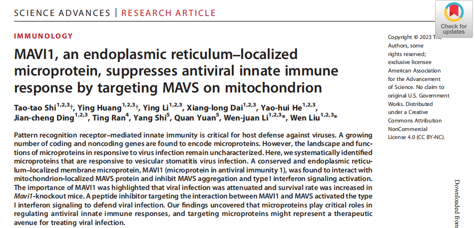 2023年9月1日,刘文教授团队在Science Advances杂志在线发表了题为MAVI1, an Endoplasmic Reticulum-localized Microprotein, Suppresses Antiviral Innate Immune Response by Targeting MAVS on Mitochondrion的研究论文。该研究发现了一个定位在内质网上的微蛋白MAVI1,并揭示了其通过靶向线粒体蛋白MAVS抑制RLR-MAVS介导的I型干扰素通路的功能和机制。