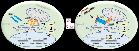 模式图:内质网定位的跨膜微蛋白MAVI1与线粒体上的MAVS蛋白竞争结合RIG-I,从而抑制I型干扰素信号通路激活。VSV感染后,MAVI1下调,其对RIG-I与MAVS相互作用的抑制作用减弱,从而激活I型干扰素通路。靶向MAVI1和MAVS相互作用的短肽抑制剂能够干扰MAVI1-MAVS相互作用,从而激活I型干扰素通路,增强宿主抗病毒先天免疫效应。