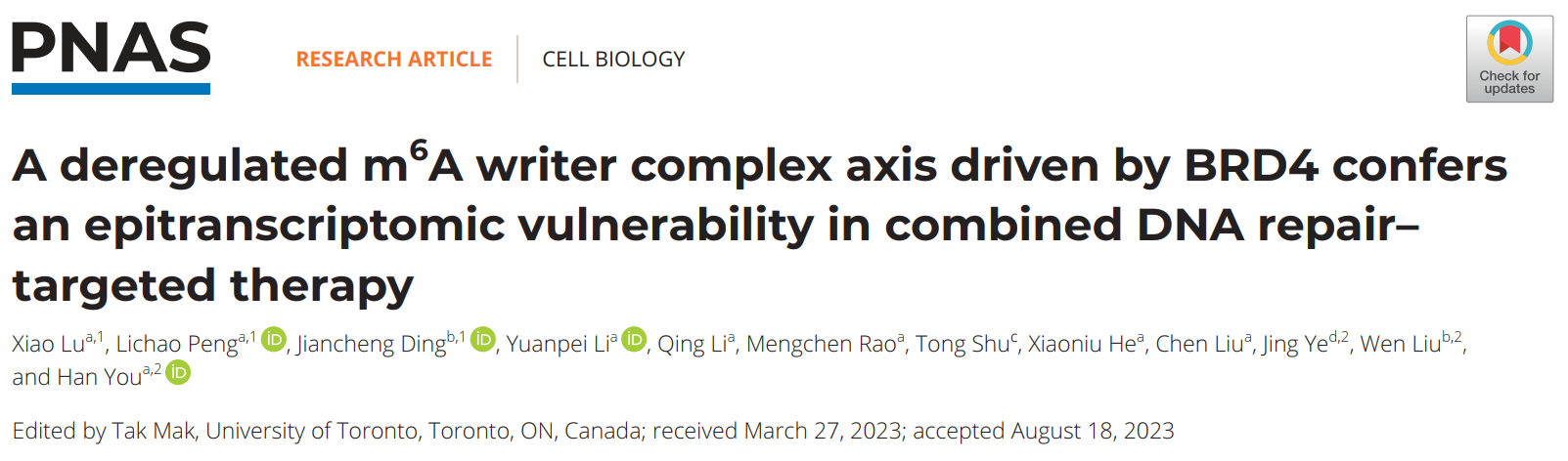 近日,尤涵教授研究团队在PNAS上发表题为A deregulated m6A writer complex axis driven by BRD4 confers an epitranscriptomic vulnerability in combined DNA repair–targeted therapy的研究论文,该工作揭示了BRD4通过调控MTC影响m6A丰度及其在BETi/PARPi联合靶向治疗中的功能。
