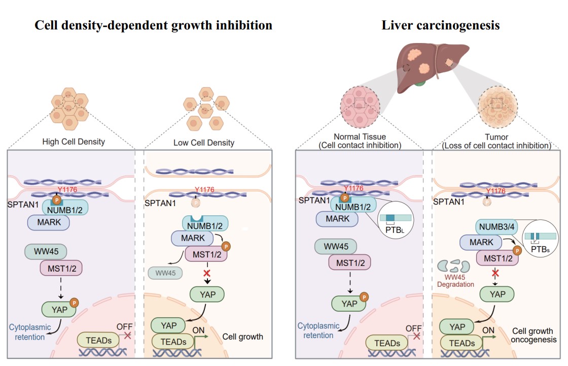 2023年10月16日,周大旺/陈兰芬团队在The Journal of Clinical Investigation杂志上发表了题为The SPTAN1/NUMB axis senses cell density to restrain cell growth and oncogenesis through Hippo signaling的研究论文。这项研究证明了SPTAN1-NUMB作为细胞密度传感器,通过将外部细胞-细胞接触信号整合到细胞内的Hippo-YAP信号来抑制细胞生长和肿瘤发生。同时还揭示了NUMB异构体剪接在细胞接触抑制丧失和癌症发生中的重要作用。