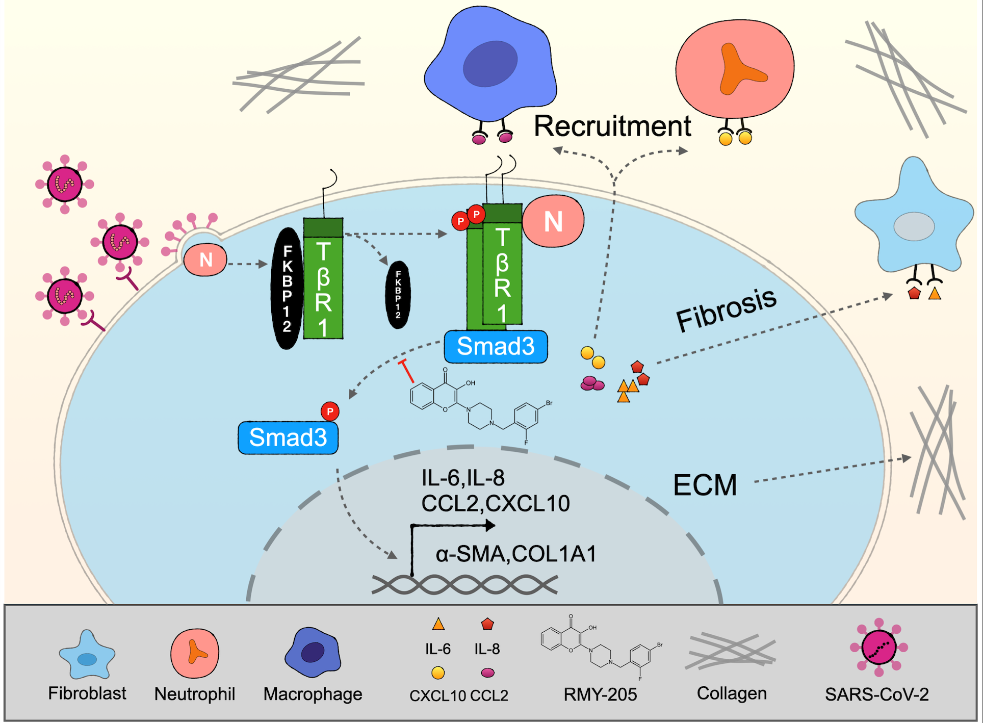 综上所述,本文阐明了SARS-CoV-2引发肺纤维化的全新分子机制,并筛选出一种以Smad3为靶点,有效干预肺纤维化的小分子化合物RMY-205,为治疗SARS-CoV-2引发的肺纤维化提供了新思路和新颖的先导化合物。