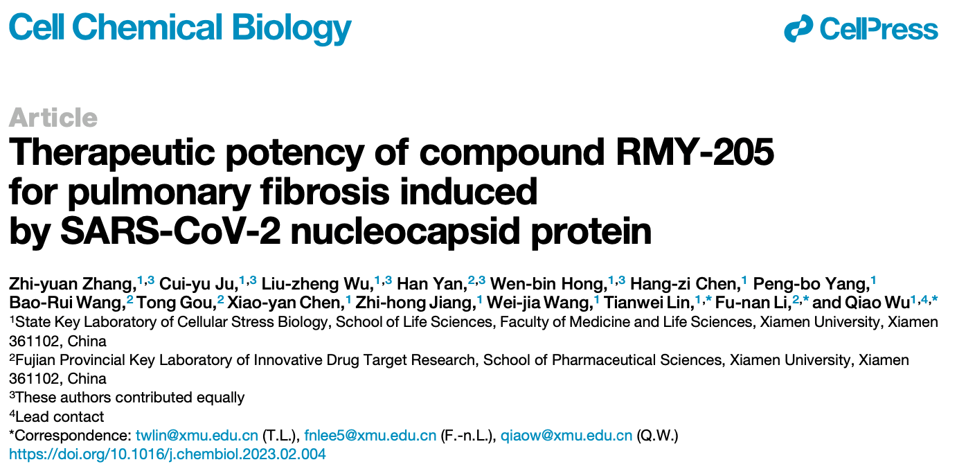 2023年3月16日,吴乔、林天伟和药学院李福男三个课题组合作在Cell Chemical Biology发表题为“Therapeutic potency of compound RMY-205 for pulmonary fibrosis induced by SARS-CoV-2 nucleocapsid protein ”的研究成果,揭示了SARS-CoV-2编码的N蛋白通过激活肺成纤维细胞促进肺纤维化进程,并开发出有效的抗纤维化的小分子化合物RMY-205。