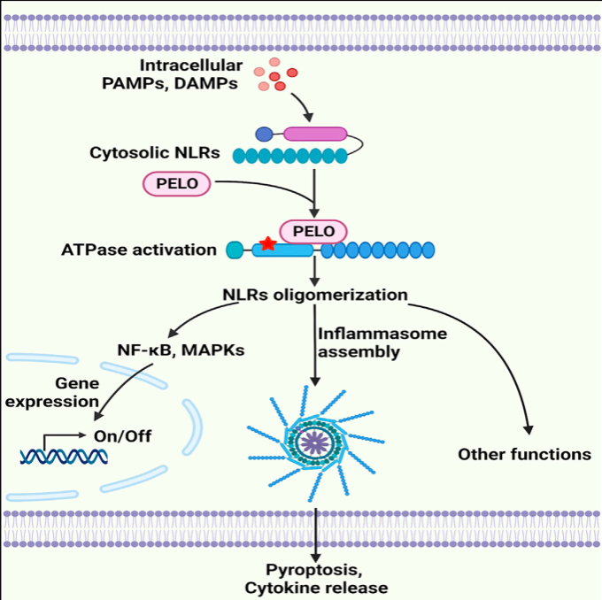 综上所述,该研究揭示了PELO的全新免疫学功能,发现PELO是所有胞质内NOD样受体蛋白的互作因子;PELO通过高效激活NLR蛋白的ATPase活性,控制NLR蛋白的寡聚化组装和激活,从而参与调控NLR家族蛋白介导的多种免疫炎症反应。