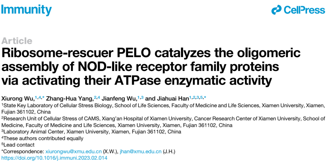 2023年3月21日,韩家淮院士团队在Immunity杂志上发表题为 Ribosome-rescuer PELO catalyzes the oligomeric assembly of NOD-like receptor family proteins via activating their ATPase enzymatic activity 的研究论文,报道了核糖体质量控制关键因子PELO通过激活NOD样受体家族蛋白的ATPase活性,控制其寡聚化组装和激活。