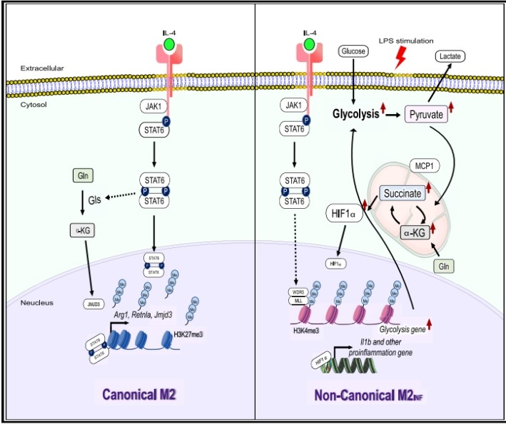 2023年5月,郑世进教授团队在Cell Reports发表研究论文The glycolysis/HIF-1a axis defines the inflammatory role of IL-4-primed macrophages。该研究发现,IL-4除了能诱导巨噬细胞分化为M2型巨噬细胞外,经IL-4刺激过的巨噬细胞在接受后续刺激时,具有明显增强的促炎特性,称之为M2INF巨噬细胞。这M2INF巨噬细胞具有训练免疫效应,意味着它们在受到初次刺激后,可以通过改变细胞代谢和表观遗传修饰来增强对后续刺激的免疫应答。