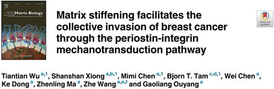 2023年5月23日,欧阳高亮教授团队在Matrix Biology在线发表研究性论文“Matrix stiffening facilitates the collective invasion of breast cancer through the periostin-integrin mechanotransductionpathway”,发现在乳腺癌发展过程中,组织硬度的增加可通过YAP-Periostin-Integrin介导的机械应力传导信号促进乳腺癌肿瘤细胞的集体侵袭。