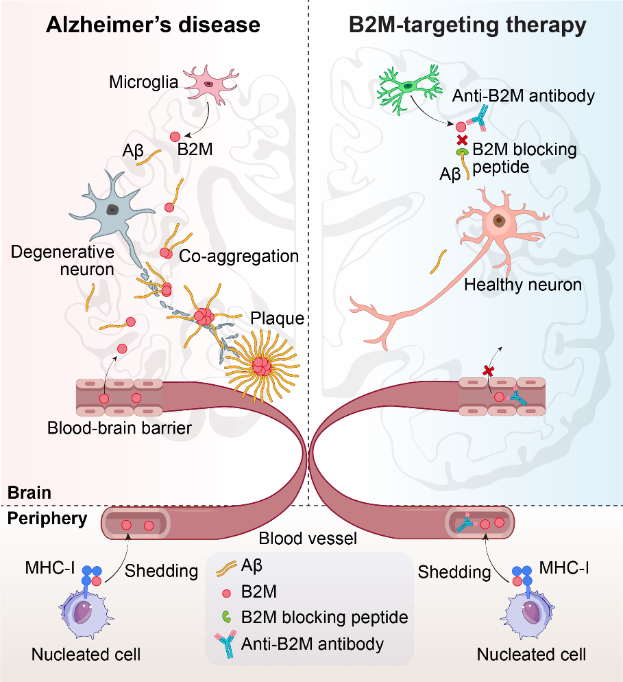 综上所述,研究团队发现了一类对AD病理发生至关重要的淀粉样蛋白共聚物B2M-Aβ,鉴定出B2M是介导淀粉样蛋白毒性的关键因子;基于B2M可以穿梭血脑屏障的特点,提出了靶向外周B2M作为AD治疗的潜在策略。