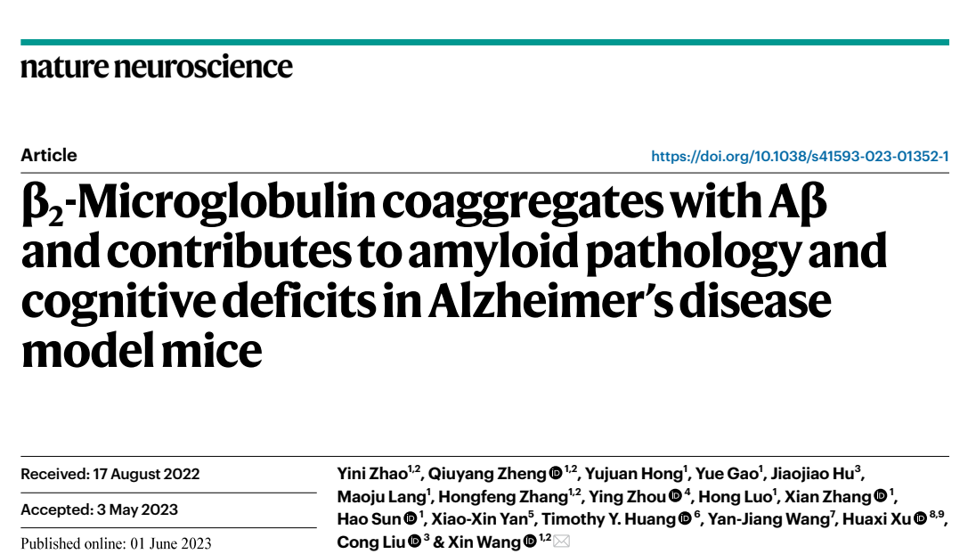 2023年6月1日,王鑫教授团队于Nature Neuroscience期刊在线发表了题为“β2-microglobulin coaggregates with Aβ and contributes to amyloid pathology and cognitive deficits in Alzheimer’s disease model mice”的研究成果。该研究发现在AD患者脑组织中B2M可以和Aβ结合并加重其神经毒性,通过靶向清除B2M或干扰B2M与Aβ的结合可以显著逆转AD小鼠认知缺陷。该研究重新检视了淀粉样蛋白学说,对Aβ的神经毒性理论做出了重要的补充;同时另辟蹊径地寻找AD治疗的外周靶点,提出干预外周B2M减轻AD神经病理的新策略