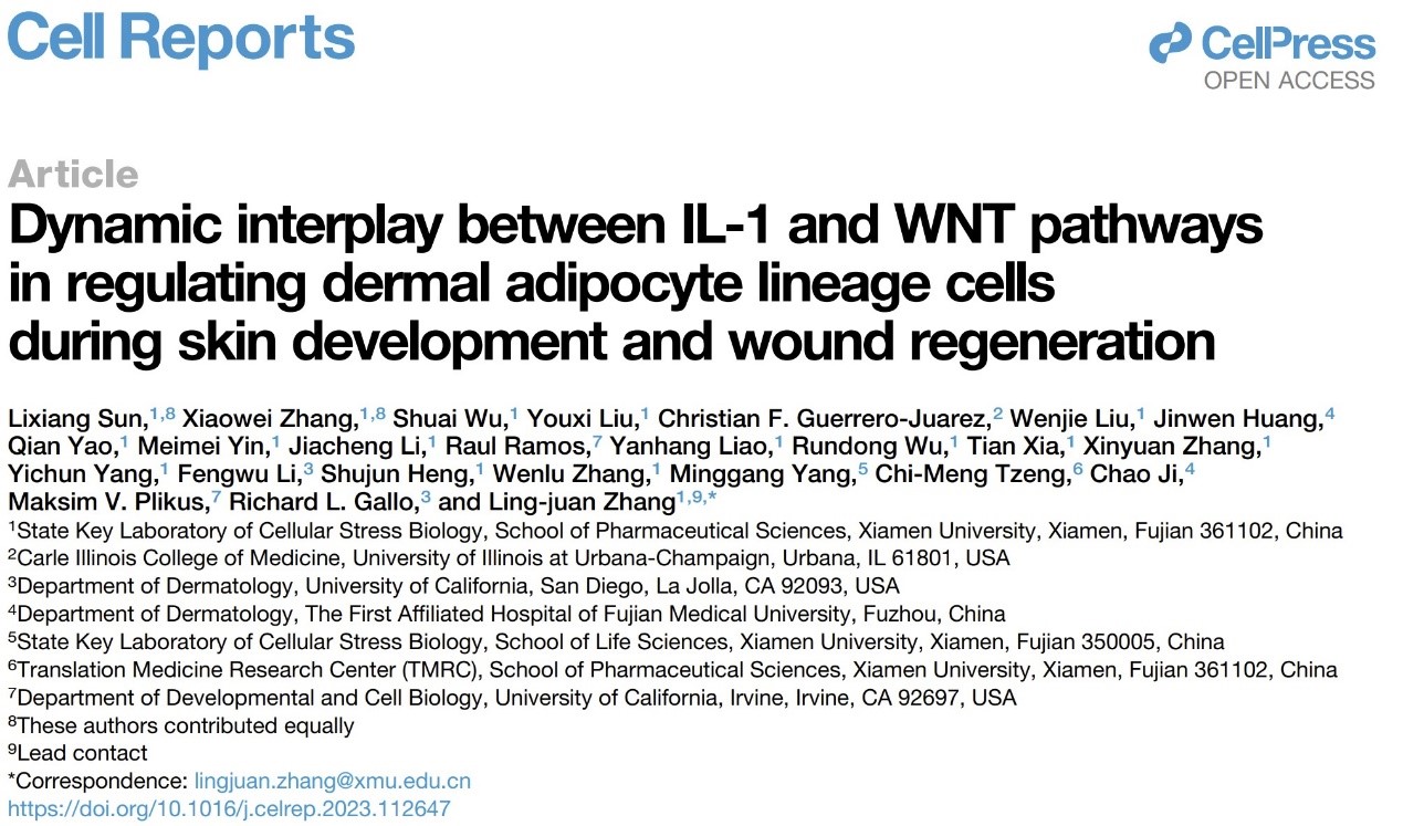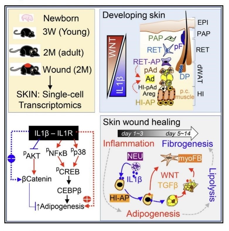 2023年6月,厦门大学细胞应激生物学国家重点实验室张凌娟教授课题组在Cell Reports发表研究论文“Dynamic interplay between IL1 and WNT pathways in regulating dermal adipocyte lineage cells during skin development and wound regeneration”。该研究使用多种转基因小鼠模型,结合不同年龄皮肤和伤口组织的小鼠单细胞转录组测序大数据分析和原代细胞功能验证等手段,首次定义了皮肤中脂肪谱系细胞的异质性,并揭示了皮肤脂肪细胞在伤口中的分化和去分化的途径和调控网络,发现脂肪分化和脂解再分化过程是受IL1-pCREB 和WNT-β catenin通路动态调控的。
