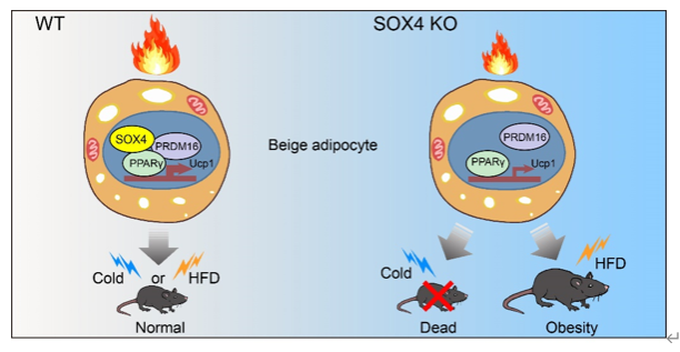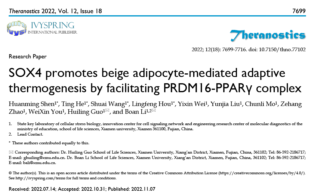 SOX4是调控干细胞特性、分化和多种发育途径的重要发育转录因子。近日,李博安教授与郭慧玲助理教授团队在《Theranostics》发表论文,发现在长期冷刺激下,SOX4可以通过促进PRDM16-PPARγ复合体形成促进米色脂肪细胞介导的适应性产热。