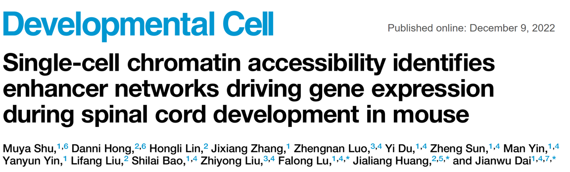 此外,黄佳良团队联合中国科学院遗传与发育生物学研究所的戴建武团队和陆发隆团队,将eNet算法成功应用于解析小鼠脊髓发育过程中的增强子调控网络,并利用小鼠体内增强子敲除模型揭示了Atoh1增强子调控网络在小鼠脊髓发育过程中的功能,验证了eNet算法的预测结果。相关工作的研究成果于2022年12月9日发表在Developmental Cell杂志,标题为Single-cell chromatin accessibility identifies enhancer networks driving gene expression during spinal cord development in mouse。