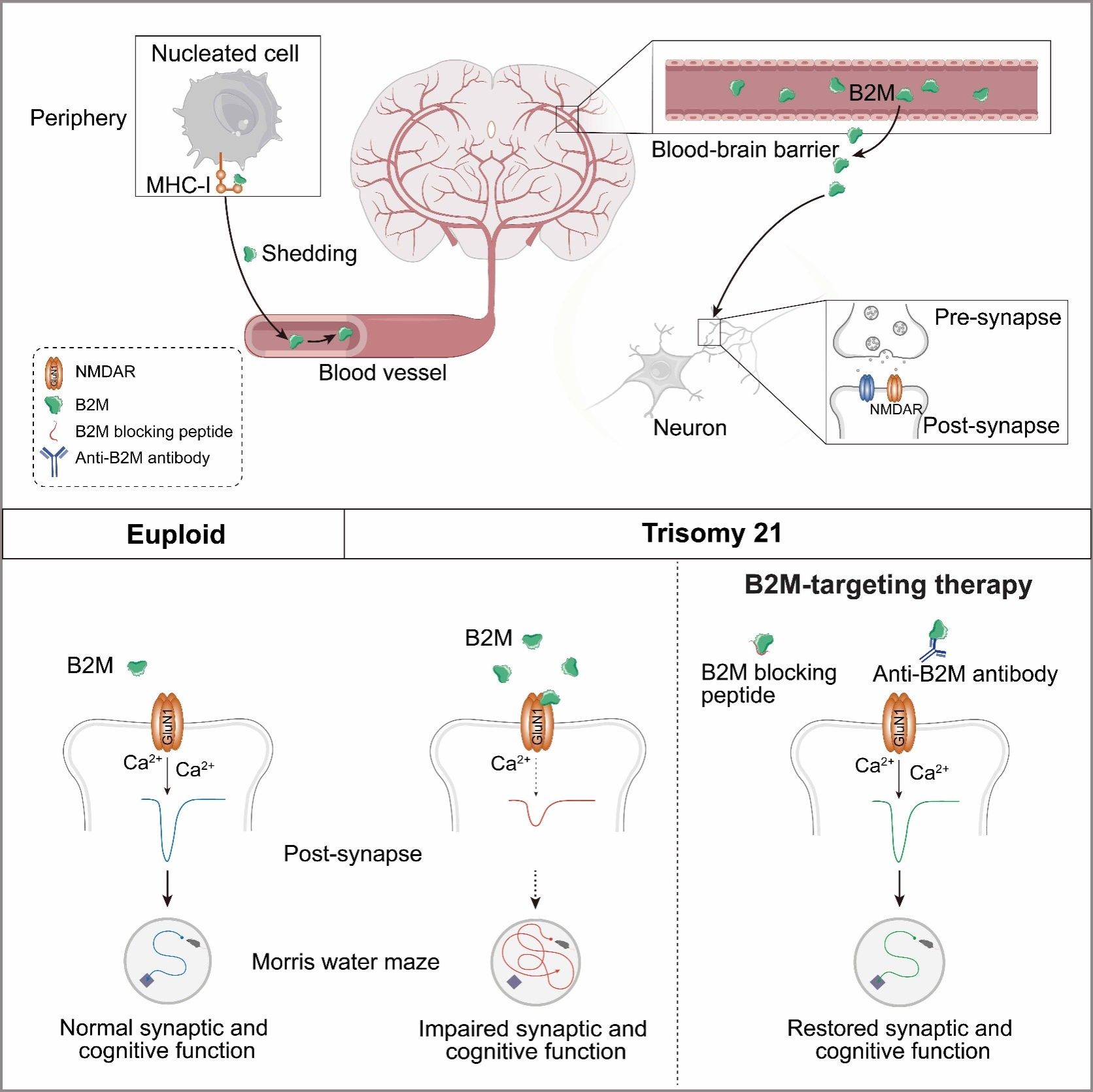 唐氏综合征(Down syndrome, DS),又称21-三体综合征,是先天性智力障碍的最常见原因。目前唐氏患儿出生率接近1/800,预计中国约有100万唐氏患者,给家庭和社会造成沉重负担。除了神经系统功能异常,唐氏患者表现出血液系统疾病高发的问题,如白血病和免疫力低下。王鑫教授团队首次发现了外周血参与唐氏综合征认知障碍,揭示了患者血液中增加的β2-微球蛋白(简称B2M)可以通过血脑屏障进入大脑导致认知损伤的新机制。团队进一步研究发现,通过抗体治疗减少外周血中的β2-微球蛋白水平成功地逆转了小鼠的认知障碍。