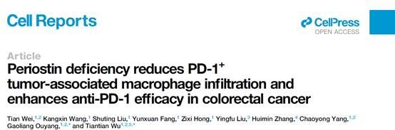 2023年2月28日,我院吴甜甜助理教授和欧阳高亮教授团队在Cell Reports发表研究论文Periostin deficiency reduces PD-1+ tumor-associated macrophage infiltration and enhances anti-PD-1 efficacy in colorectal cancer。在之前的研究基础上,该课题组进一步发现Periostin通过增加PD-1+ TAMs的浸润来促进结直肠癌肿瘤细胞免疫逃逸,进而提出联合抑制Periostin和PD-1蛋白表达来抑制结直肠癌发展的治疗策略。