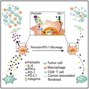 Periostin是一种分泌性的细胞外基质蛋白,在肿瘤转移微环境、肿瘤干细胞微环境、肿瘤血管周微环境、肿瘤转移前微环境、肿瘤纤维化微环境以及骨髓微环境等肿瘤微环境中高表达。欧阳高亮教授课题组之前的研究表明,肿瘤相关成纤维细胞(Cancer-associated fibroblasts,CAFs)来源的Periostin通过Integrin-FAK-Src信号介导肿瘤细胞YAP/TAZ活化,促进肿瘤细胞增殖和分泌IL6,肿瘤细胞等细胞来源的IL6则可促进CAFs的活化和Periositn的分泌,CAFs来源的Periostin和肿瘤细胞来源的IL6两者相互调控,共同促进结直肠癌发生(Ma H, et al. Cell Reports, 2020)。该研究从肿瘤细胞与CAFs相互作用的角度,揭示了Periostin调控结直肠癌发生的机制,但对Periostin在结直肠癌肿瘤免疫抑制微环境中的功能及其作用机制并不清楚。
