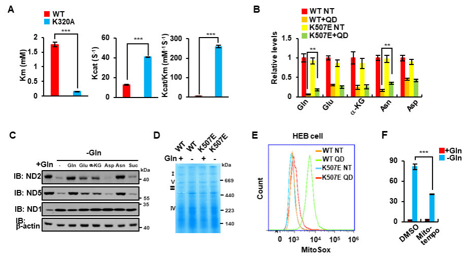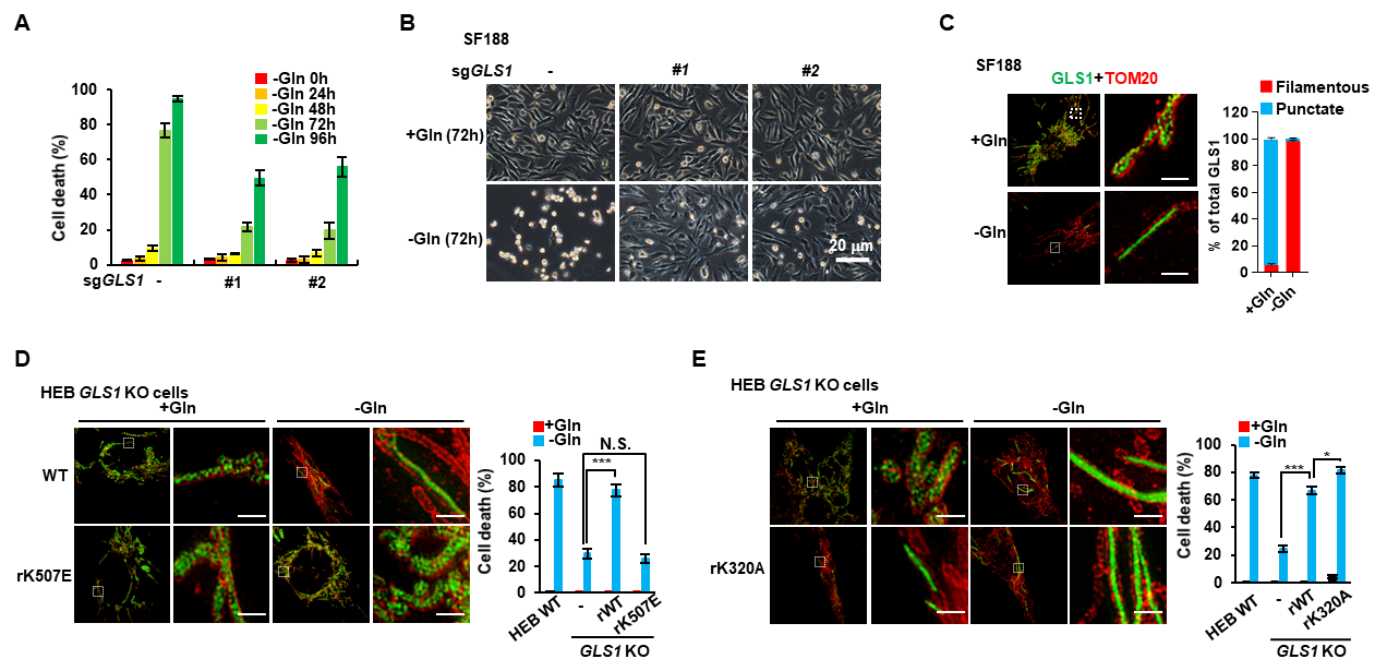 李勤喜课题组研究人员发现在多个细胞系中敲除GLS1能显著抑制由谷氨酰胺饥饿诱导的细胞凋亡。有意思地是,通过免疫荧光染色,他们发现GLS1在谷氨酰胺饥饿状态下,聚集成微米级别的杆状结构。当在细胞内表达无法形成杆状结构的GLS1 K507E突变体时,饥饿诱导的细胞凋亡明显被抑制。而过表达自发形成杆状结构的GLS1 K320A突变体则加速了谷氨酰胺饥饿诱导的细胞凋亡(图1)。