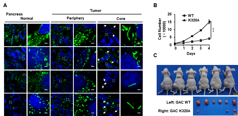 在临床胃癌和胰腺癌的样本的核心位置,大量GLS1以杆状结构的形式存在。更重要的是,在肿瘤细胞中稳定表达能自发形成杆状结构的突变体(GLS1 K320、GLS1 S482C)显著抑制了癌细胞的增殖和体内移植瘤的生长(图3),表明操纵GLS1杆状多聚体的形成可能是一种新兴的癌症治疗策略。