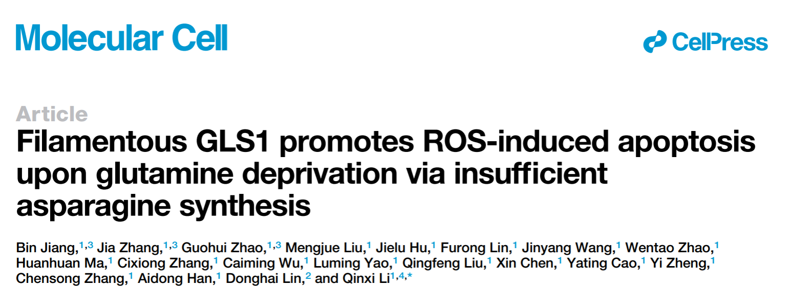 2022年4月4日,我室李勤喜课教授课题组在Molecular Cell杂志在线发表了题为Filamentous GLS1 promotes ROS-induced apoptosis upon glutamine deprivation via insufficient asparagine synthesis的研究论文。该研究首次报道了谷氨酰胺缺乏能够诱导谷氨酰胺酶(GLS1)形成杆状多聚体进而促进细胞凋亡的机理。
