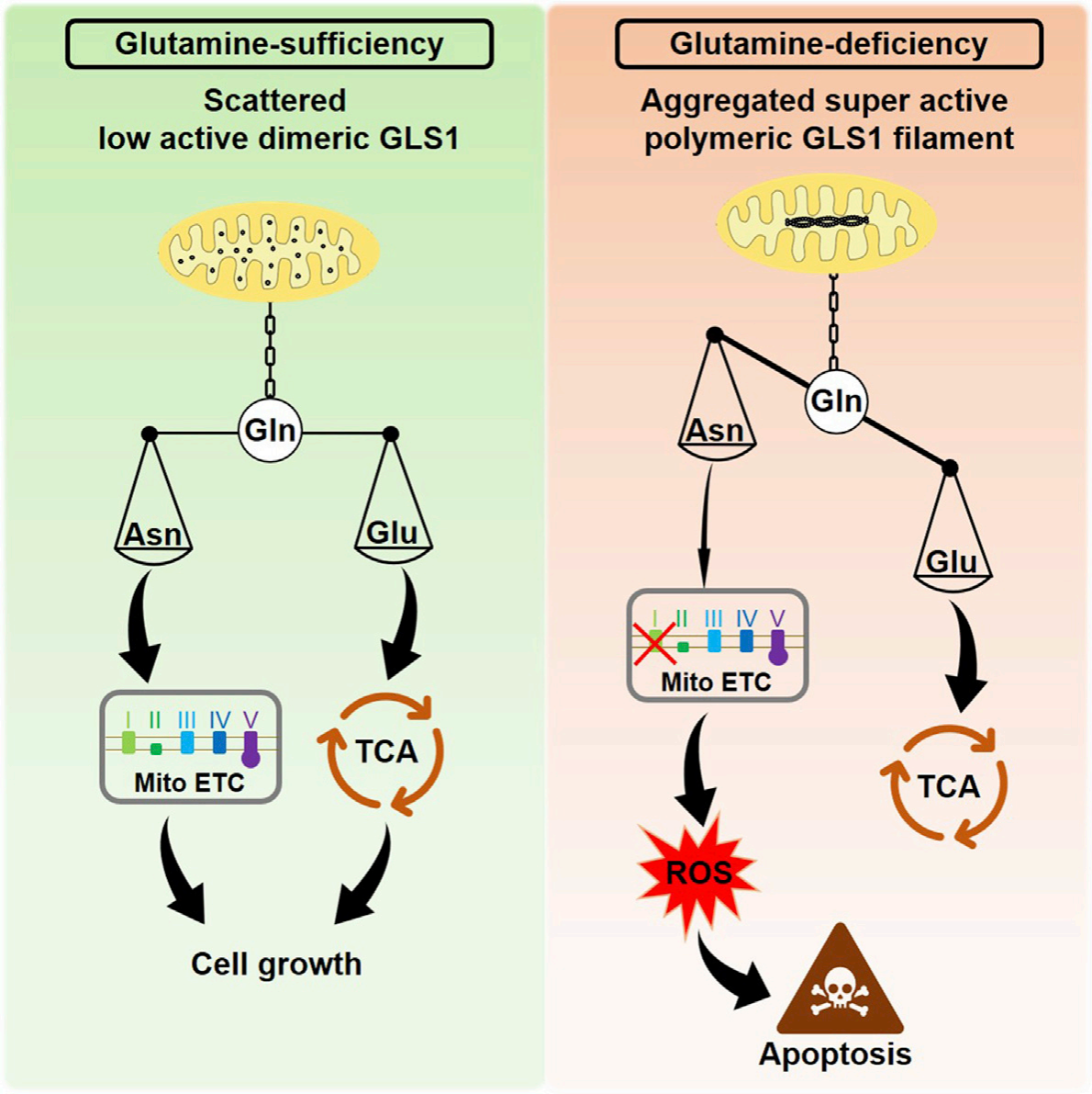 进一步研究表明谷氨酸是细胞内GLS1形成杆状结构的负调控因子。细胞处于谷氨酰胺饥饿状态时,谷氨酰胺衍生出来的谷氨酸浓度下降。当谷氨酸浓度低于一定阈值时,失去了对GLS1的抑制作用,此时GLS1由二聚体形式聚合成微米级别的杆状结构。细胞实验和体外酶活实验表明,杆状结构的形成极大地促进了GLS1与其底物谷氨酰胺的亲和力和催化活性。机理研究表明,高度活化的GLS1杆状多聚物能够进一步将细胞内本已稀少的谷氨酰胺转化为谷氨酸,造成谷氨酰胺的耗竭。在此情况下,依赖于谷氨酰胺的天冬酰胺的合成亦被抑制,进而引起线粒体基因组编码的蛋白合成受限、线粒体呼吸链的复合体被破坏,最终导致ROS的大量累积和细胞凋亡(图2)。