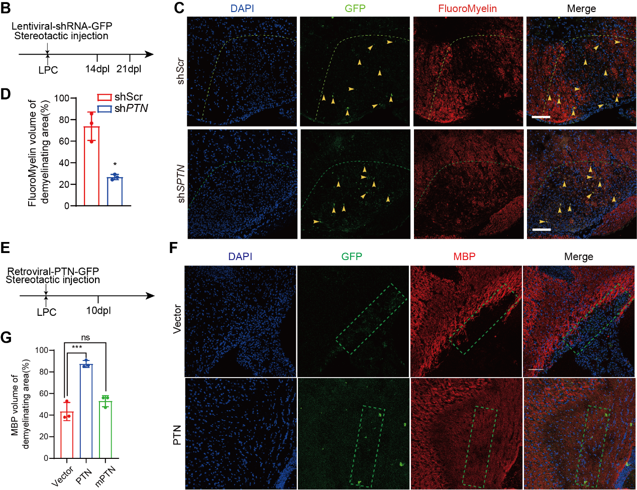 最后,在溶血卵磷脂诱导的髓鞘损伤模型中,作者发现髓鞘损伤后,PTN表达上调。利用病毒敲低PTN的表达,抑制髓鞘再生进程;相反,过表达PTN,可以促进髓鞘再生的速率。该研究通过原代细胞和小鼠模型阐述了COPII介导的膜泡运输在髓鞘生成过程中的生理功能,指出了PTN-PTPRZ1通路可能作为脱髓鞘疾病的治疗靶点。