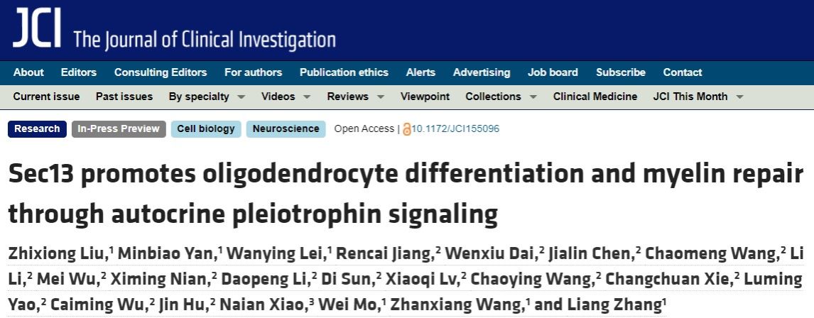 2022年4月2号,我室张亮团队与附属第一医院王占祥团队合作在Journal of Clinical Investigation上发表题为Sec13 promotes oligodendrocyte differentiation and myelin repair through autocrine pleiotrophin signaling的研究成果,首次发现了COPII介导的自分泌在少突细胞分化和髓鞘再生中发挥重要的功能,为脱髓鞘相关疾病的治疗提供了新的思路。