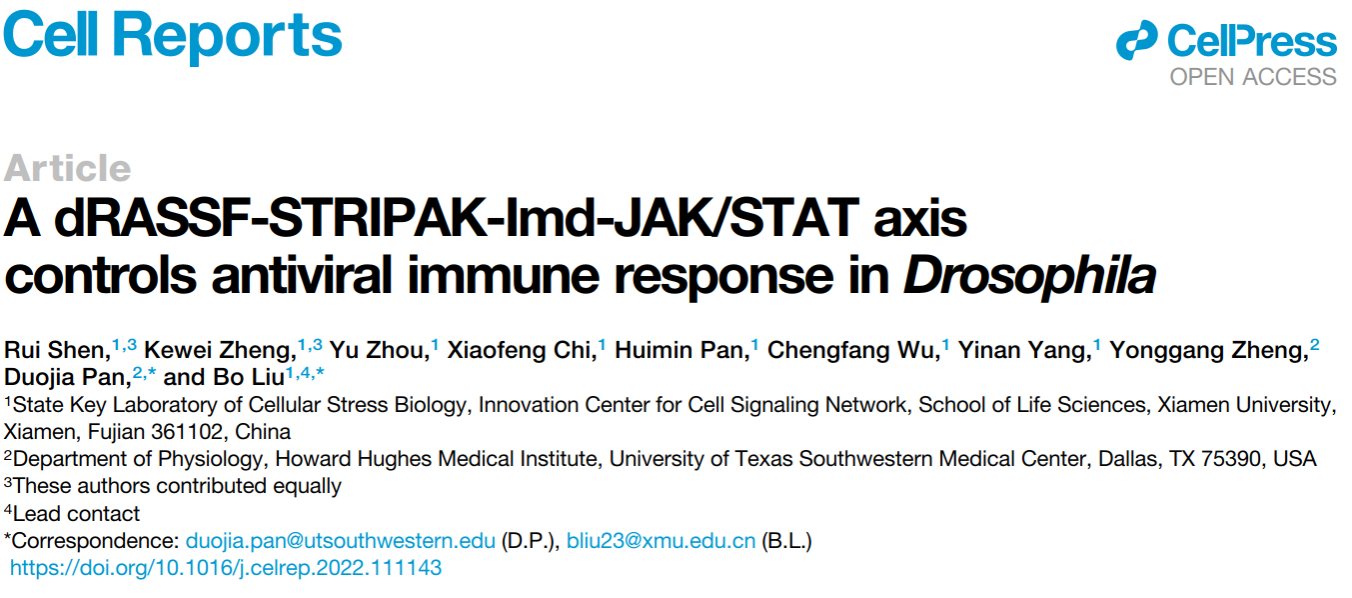 7月28日,刘波课题组在《Cell Reports》发表题为A dRASSF-STRIPAK-Imd-JAK/STAT axis controls antiviral immune response in Drosophila的研究论文。该研究揭示肿瘤抑制因子dRASSF通过调节Imd信号通路,进而调节JAK/STAT信号通路活性从而参与果蝇抗病毒免疫反应调控。