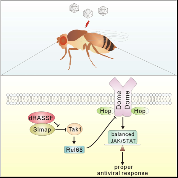 研究人员首先发现dRassf突变果蝇对于病毒感染异常敏感,表明该基因参与抗病毒免疫反应。为了揭示该基因在抗病毒先天免疫中的作用机制,研究团队对dRassf突变果蝇和野生型果蝇在病毒侵染前后的转录组进行了RNA测序,发现dRassf突变果蝇中病毒感染导致的Imd信号通路的激活受损,而JAK/STAT信号通路活性则较野生型果蝇更强。激活Imd信号通路或抑制JAK/STAT信号通路均可以完全逆转dRassf突变果蝇对于病毒的敏感性,表明dRassf是通过调节这两条先天免疫信号通路活性从而调节抗病毒先天免疫应答。进一步的机制研究表明,dRASSF通过保护Imd信号通路关键激酶Tak1免受STRIPAK PP2A磷酸酶复合物的抑制从而维持病毒感染后Imd信号通路的激活。活化的Imd信号通路转录因子Rel干扰JAK/STAT信号通路的细胞膜上受体Dome的二聚化进而抑制JAK/STAT信号通路的过度激活,最终维持适当的抗病毒免疫反应水平。重要的是,RASSF的抗病毒作用在哺乳动物细胞中也是保守的。