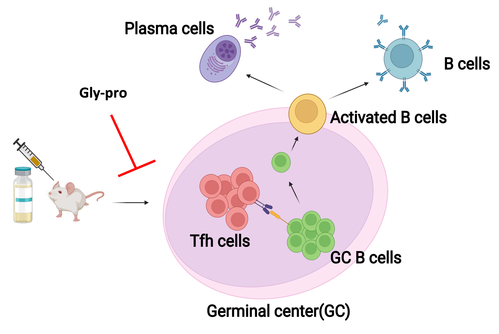 于是,研究人员使用SARS-CoV-2 RBD蛋白片段单剂腹腔注射BALB/c雌鼠,并检测免疫细胞亚群(生发中心的B细胞(GC B cells),滤泡辅助性T细胞(Tfh)和浆细胞(plasma cells),以阐明甘氨酰脯氨酸可以调节抗体免疫应答。结果发现,注射甘氨酰脯氨酸或N-苄氧羰基-L-脯氨酸均可以显著下调免疫细胞亚群的水平,但甘氨酰脯氨酸和DPP4抑制剂西格列汀的联合给药可以逆转甘氨酰脯氨酸带来的负面效果。