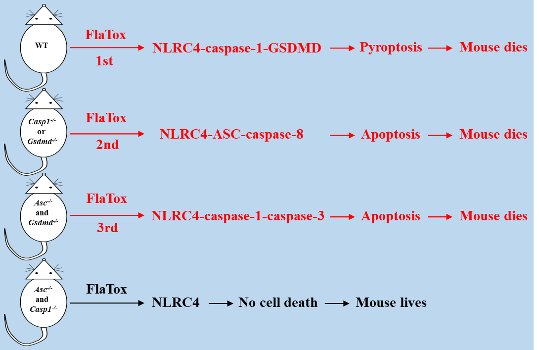 炎症小体(inflammasome)是由模式识别受体(PRR)蛋白组装而成的多蛋白复合物,以响应病原体相关模式分子(PAMP)和非病原体应激信号。炎症小体能够激活caspase-1剪切细胞因子前体pro-IL-1β和pro-IL-18使其成熟,同时caspase-1可以剪切GSDMD诱导细胞发生焦亡(pyroptosis)进而促进成熟IL-1β和IL-18的释放 。目前研究比较多的经典炎症小体包括NLRP3, NLRP1b,NLRC4,AIM2和Pyrin炎症小体。在经典炎症小体激活过程中,Casp1基因的缺失可阻断其介导的焦亡,但细胞仍通过凋亡途径死亡。2015年厦门大学韩家淮课题组发现在Gsdmd基因缺失的情况下激活经典炎症小体同样导致细胞发生凋亡。但是能够通用于彻底阻断经典炎症小体激活导致的细胞死亡蛋白或蛋白组合仍不明了。更为重要的是在经典炎症小体过度激活后产生的炎症风暴,脂质风暴及细胞死亡在小鼠个体死亡的过程中各扮演什么样的角色还不明确。这些也是细胞死亡和个体死亡研究领域内重要的科学问题。