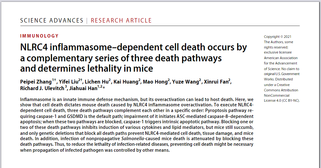 10月22日Science Advances杂志在线发表了厦门大学细胞应激生物学国家重点实验室韩家淮课题组题为“NLRC4 inflammasome–dependent cell death occurs by a complementary series of three death pathways and determines lethality in mice”的研究成果,揭示了在 NLRC4炎症小体过度激活的状态下可有顺序地分别激活三条死亡路线(即1:NLRC4-caspase-1-GSDMD焦亡通路;2:NLRC4-ASC-caspase-8凋亡通路;3:NLRC4-caspase-1-caspase-3凋亡通路)导致细胞死亡和小鼠死亡的分子机制。