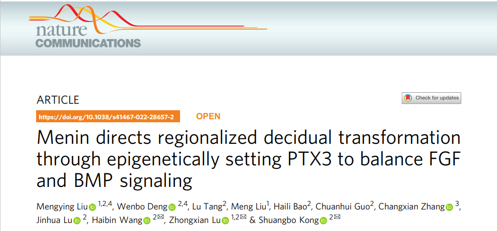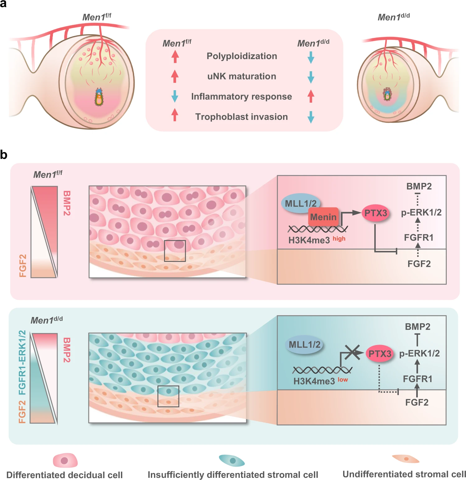 课题组通过合作研究发现,H3K4甲基转移酶复合体MLL1/2-COMPASS中的特异性亚基Menin能通过H3K4me3改变启动子附近的染色质状态,参与调控相关基因的转录激活。小鼠子宫特异性敲除Men1(编码Menin蛋白)导致雌性小鼠生育力显著降低,在妊娠中期出现胚胎的流产现象,原因是子宫内膜蜕膜发育的缺陷。分子机制研究证明Menin是平衡基质细胞增殖信号与分化信号的关键蛋白,Menin-H3K4me3调控下游靶基因PTX3表达,抑制来自未分化基质细胞层的FGF2,防止FGF2以旁分泌的形式激活次级蜕膜区中的ERK1/2,保证Bmp2在蜕膜分化区域的稳定表达。Menin在基质细胞的缺失导致FGF2-ERK1/2信号异常激活和Bmp2表达被抑制,从而导致基质细胞蜕膜发育分化不足。