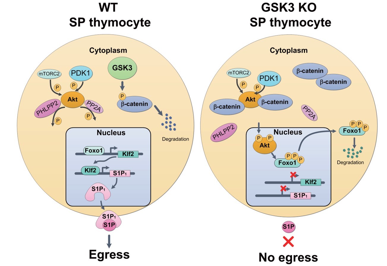 Wnt/β-catenin信号通路已知在维持干细胞特性、细胞分化等具有重要作用,该信号异常激活能够促进细胞恶性增殖等形成肿瘤。糖原合成酶激酶3(GSK3)包含两个亚基:GSK3α和GSK3β,其可以与APC、AXIN1、CK形成复合体,能够磷酸化β-catenin导致其泛素化降解,以此维持了Wnt/β-catenin信号通路在机体内的正常表达和行使功能。自1981年GSK3被发现以来,已经证明了其在神经系统、骨骼新生、糖尿病、肿瘤中发挥多种生物学功能。但是其在T细胞生物学中的研究还有待深入。研究人员利用GSK3afl/fl,GSK3bfl/fl;CD4Cre(DKO)小鼠分析发现,DKO小鼠外周免疫器官中T细胞几近消失,利用胸腺细胞示踪技术发现,DKO小鼠胸腺成熟T细胞迁移出现明显缺陷。通过转录组学结合蛋白水平分析发现,DKO小鼠胸腺T细胞中Foxo1/KLF2/S1P1信号通路出现明显缺陷,该通路是已知的调控胸腺成熟T细胞迁出的重要通路,进一步分析发现,GSK3缺失后导致Akt激酶异常激活,是介导Foxo1/KLF2/S1P1通路缺陷的主要原因。为了证明该条信号通路的正确性,研究人员利用骨髓改造降低Akt激酶活性,或者引入持续激活的转录因子Foxo1AAA,均能够有效的回补GSK3缺失导致的迁移缺陷。研究人员接下来探究GSK3如何调控Akt激酶活性,结果发现,胞浆内高表达的β-catenin可以直接促进Akt激酶激活,机制上研究人员发现,胞浆内的β-catenin主要减低Akt和其去磷酸酶PHLPP2和PP2A的互作,从而抑制PHLPP2和PP2A对Akt的去磷酸化,以此促进了Akt激酶活性。综上,该研究首次报道了GSK3在调控胸腺成熟T细胞迁出的重要作用,并且在免疫细胞中首次揭示了β-catenin不依赖经典的转录调控而直接在胞浆内激活Akt的新型调控机制。以上工作不仅丰富和完善了胸腺成熟T细胞迁出的调控机制,同时胞浆β-catenin直接促进Akt活性的机制,也为包括白血病、淋巴瘤在内的多种肿瘤在恶性增殖、复发耐药等机制的探索中提供新的理论参考。