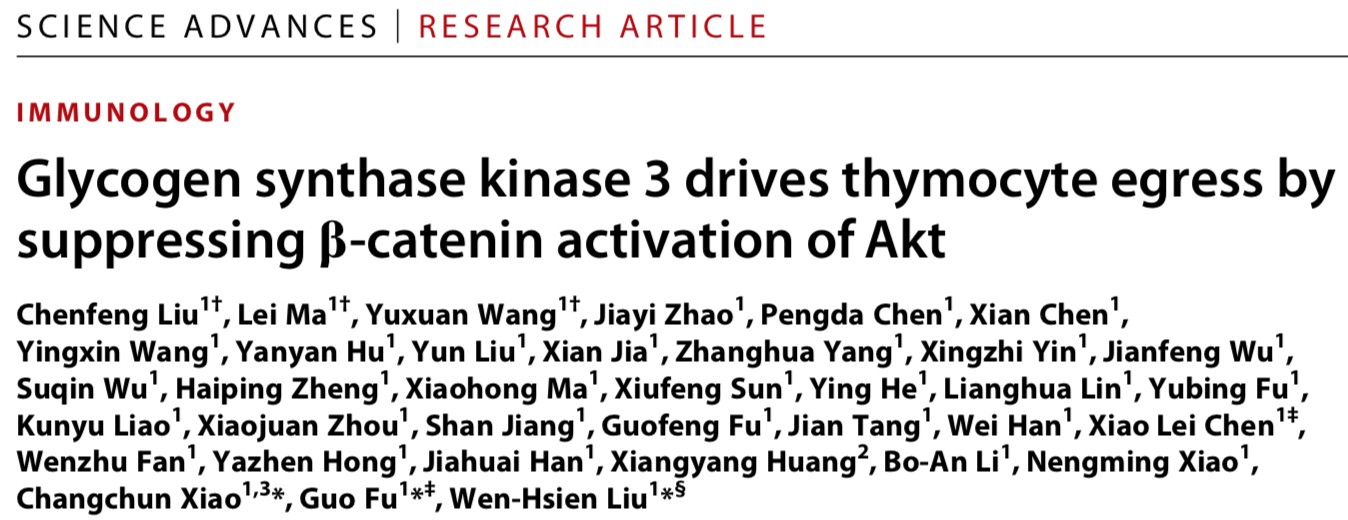 2021年10月8日,细胞应激生物学国家重点实验室刘文贤教授、付国教授课题组,在Science Advances杂志上发表了题为“Glycogen synthase kinase 3 drives thymocyte egress by suppressing β-catenin activation of Akt”的研究论文,揭示了GSK3/β-catenin信号通路在调控胸腺成熟T细胞从胸腺迁出的重要功能和调控机制,为T细胞发育和迁移的信号调控提供新的分子机制解析。