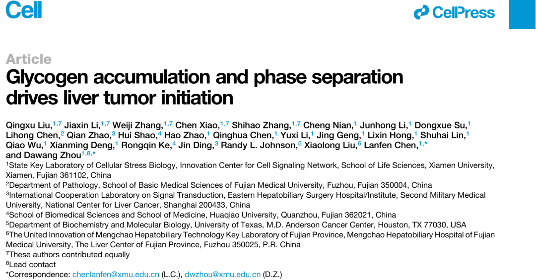 10月21日,细胞应激生物学国家重点实验室、细胞信号网络协同创新中心、厦门大学生命科学学院的周大旺和陈兰芬课题组合作在Cell杂志上发表了题为Glycogen accumulation and phase separation drives liver tumor initiation的研究论文。