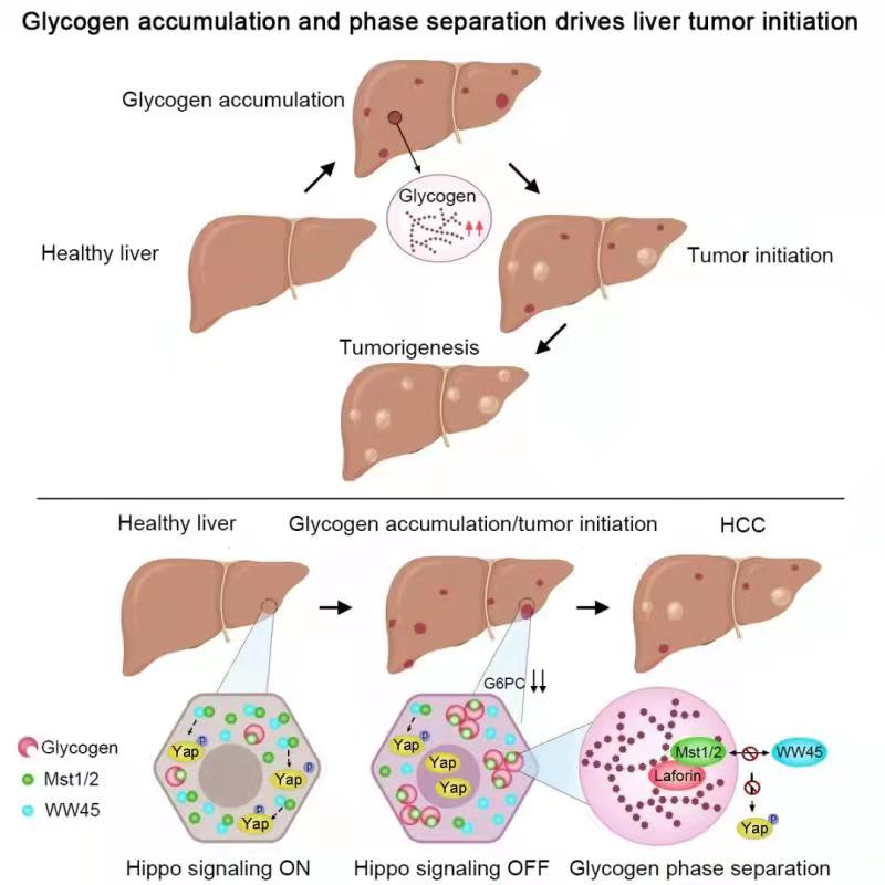 本项工作进一步阐释了累积的糖相分离造成重要抑癌的Hippo信号通路失活,激活下游原癌蛋白YAP,从而驱动肿瘤的起始。该团队早期工作发现Hippo信号通路的失活能导致肝脏组织快速增生,3个月内肝脏增大10-15倍,4-5个月内100%产生肝癌。