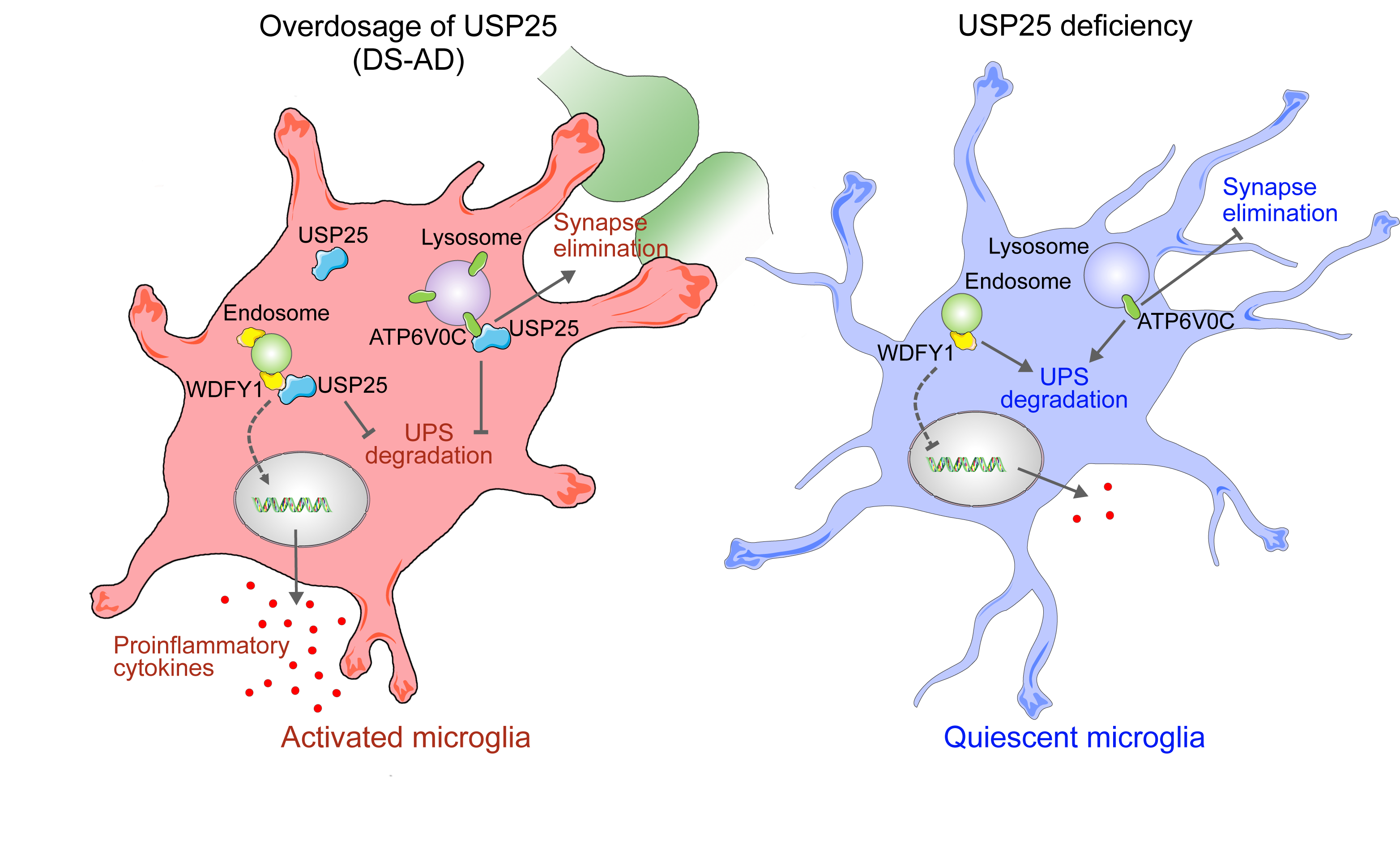 研究团队构建了人工细菌染色体(Bacterial artificial chromosome,BAC)-Tg-USP25转基因小鼠,将BAC-Tg-USP25与AD模型小鼠5×FAD杂交,发现过表达USP25会导致5×FAD小鼠脑中小胶质细胞激活,加重5×FAD小鼠突触功能和认知缺陷;而敲除Usp25基因则可以减轻小胶质细胞激活和神经炎症,逆转5×FAD小鼠的突触功能和认知缺陷。从机制上,研究团队发现USP25介导WDFY1和ATP6V0C的去泛素化修饰,从而减少小胶质细胞炎症因子释放及突触吞噬(图1)。